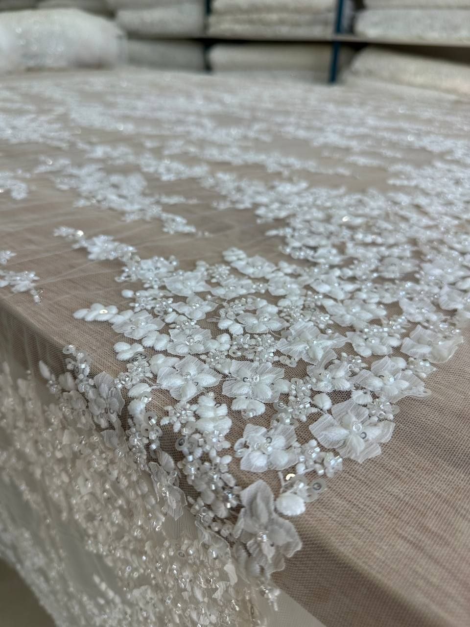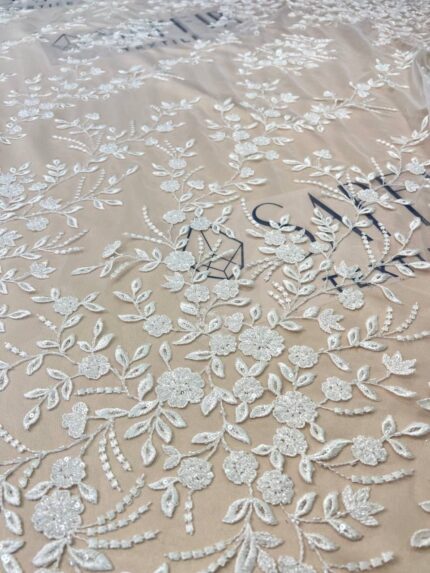Молочна весільна тканина купонного типу з вишуканим 3D декором від Sapfir Textile – це ідеальний вибір для створення елегантних весільних суконь та святкових нарядів. Завдяки об’ємним декоративним елементам тканина виглядає надзвичайно розкішно, додаючи образу витонченості та унікальності.